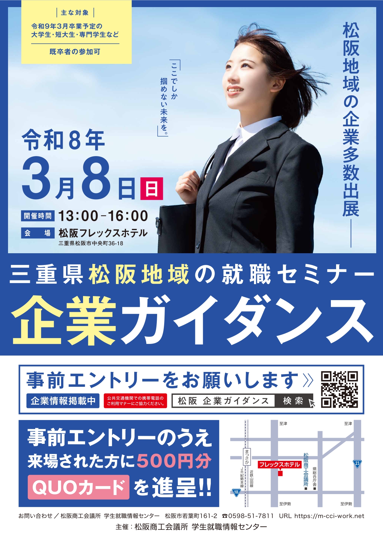 松阪商工会議所では、企業の雇用創出・拡大、また、学生の就職活動を支援し地域活性化につなげるため、企業ガイダンス(合同企業説明会)を開催します。